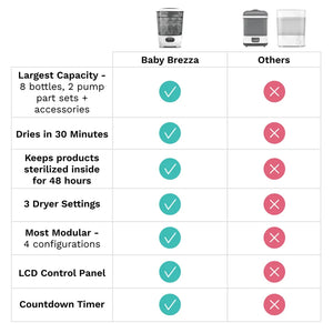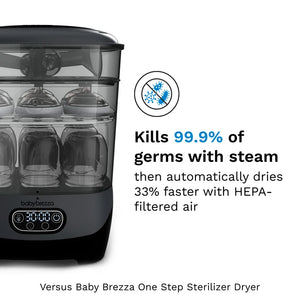 Automatically sterilizes and dries 33% faster - Compatible with any brand of bottles, pump parts, pacifiers and accessories