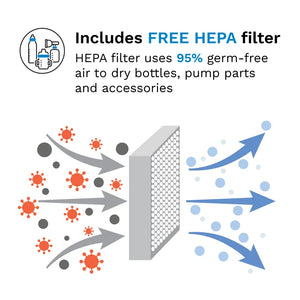 Automatically sterilizes and dries bottles, pump parts, and accessories. Kills 99.9% of germs and dries with HEPA-filtered air. 33% faster than other brands. So bottles are ready when you need them.
